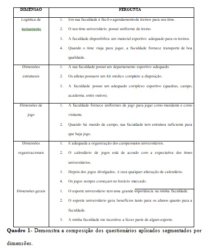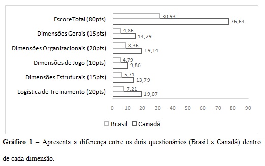 Methods: Fourteen students who had the opportunity to experience university sports in both countries (Brazil and Canada). A structured questionnaire was built, applied twice, once for each country. The questions were segmented into the dimensions: training logistics, structural dimensions, game dimensions, organizational dimensions and overall dimensions. The reliability index of the instrument was verified using the Cronbach alpha coefficient. The Wilcoxon test was used to verify significant statistical difference between the questionnaires.